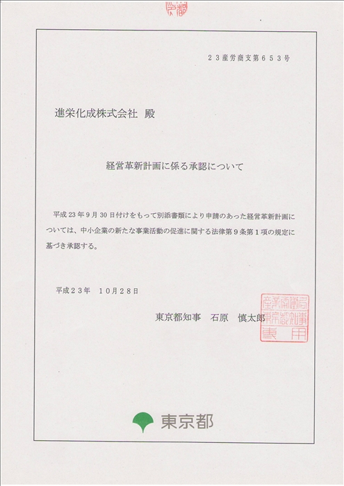 | 2011.10.28 | 東京都より「経営革新計画」が承認されました。 |